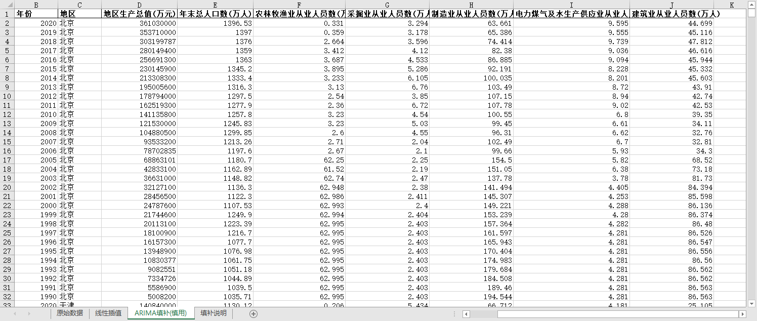 ARIMA填补。基于ARIMA模型,利用同一地区的时间序列数据,对缺失值进行预测填补。