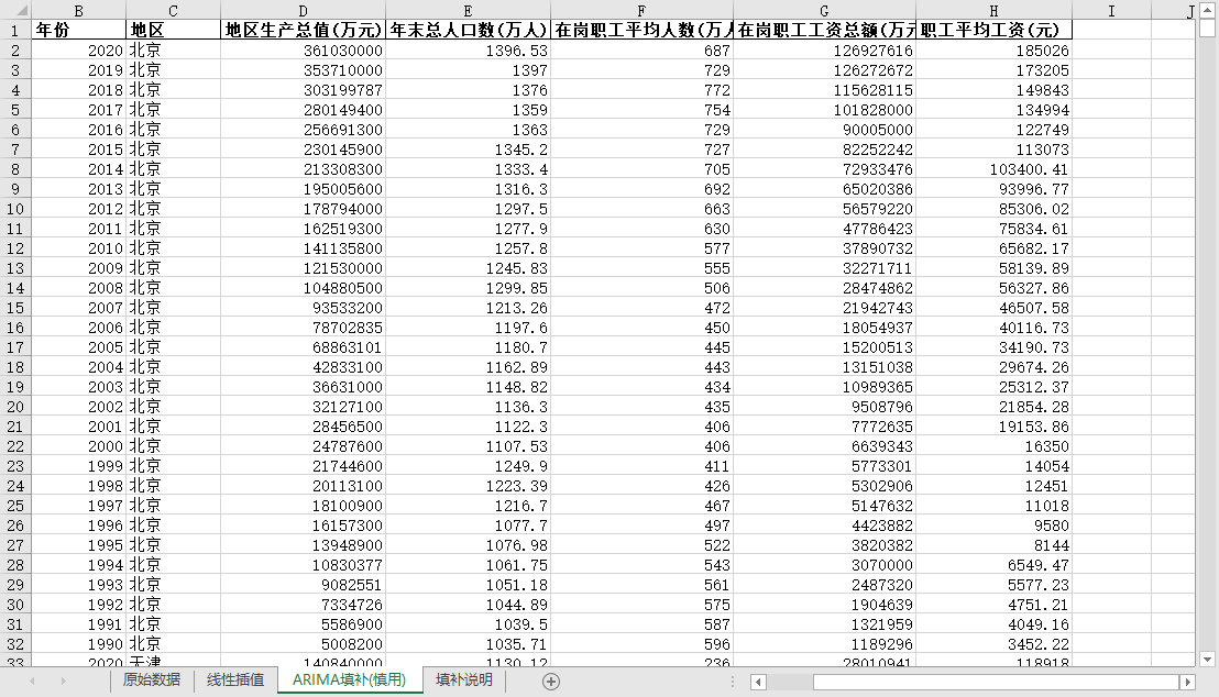 ARIMA填补。基于ARIMA模型,利用同一地区的时间序列数据,对缺失值进行预测填补。
