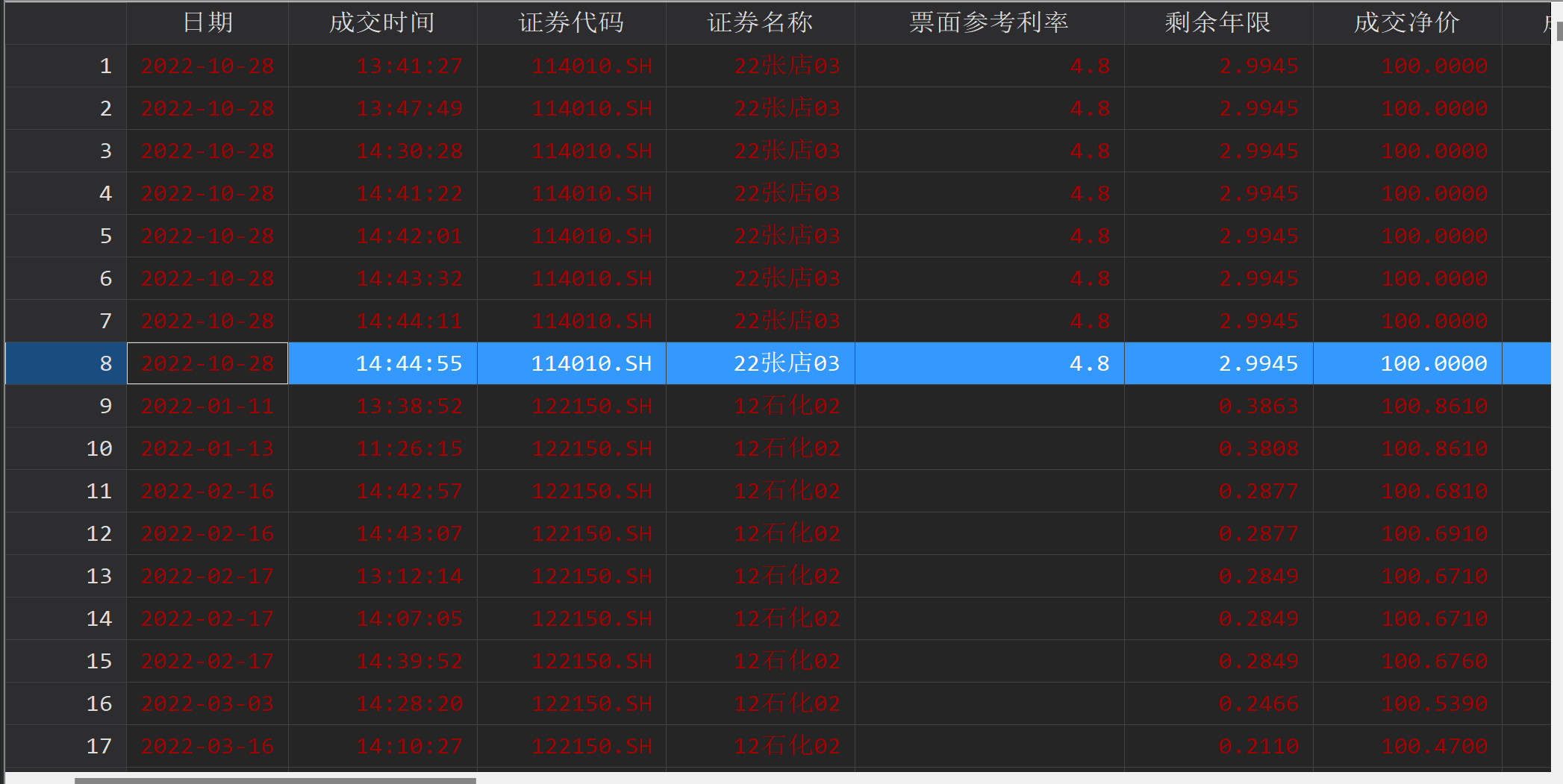 如图所示,证券114010.SH在2022量10月28日有8笔交易,最后一笔交易发生在14:44:55秒,因而本人将该笔交易的成交净价作为收盘价。我刚如何写stata代码?