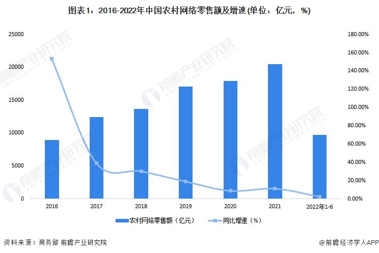 2021年,全国农村网络零售额突破2万亿元,达到2.05万亿元,同比增长11.3%。2022年上半年,全国农村网络零售额为9759.3亿元,同比增长2.5%。
