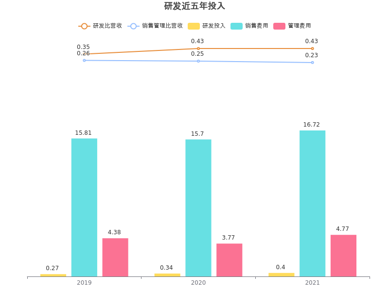 近三年,良品铺子研发投入不及销售和管理费用,近三年研发投入为1.01亿,研发占营业收入比率从2019年的0.35%提升到2021年0.43%。