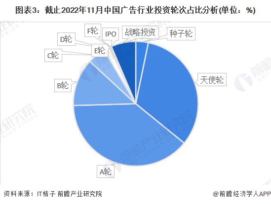 从我国广告行业投融资总体投资轮次来看,主要集中在天使轮和A轮阶段,其总占比超过70%。