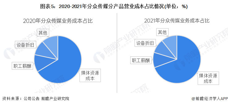 2020-2021年,分众传媒的业务成本按照产品分类看来,媒体资源成本是企业的主要成本结构,主要包含含媒体租赁相关使用权资产、折旧及影院媒体映前时长采购成本等,成本占比均超过60%,是企业的成本主要支出。