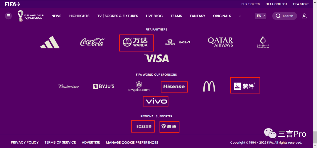 从国际足联合作伙伴,到世界杯赞助商、区域赞助商