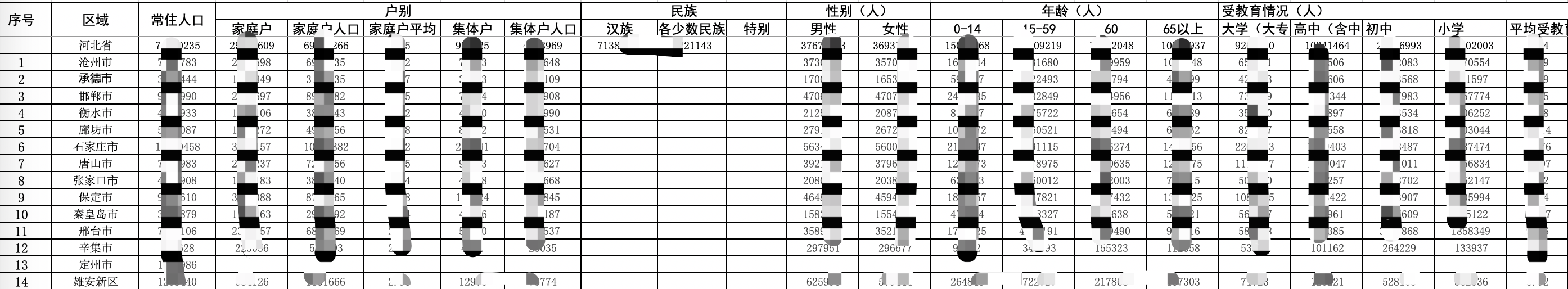 数据名称:河北省及14个地级市常住人口分户别民族男女分年龄受教育情况城乡流动人口数2020年