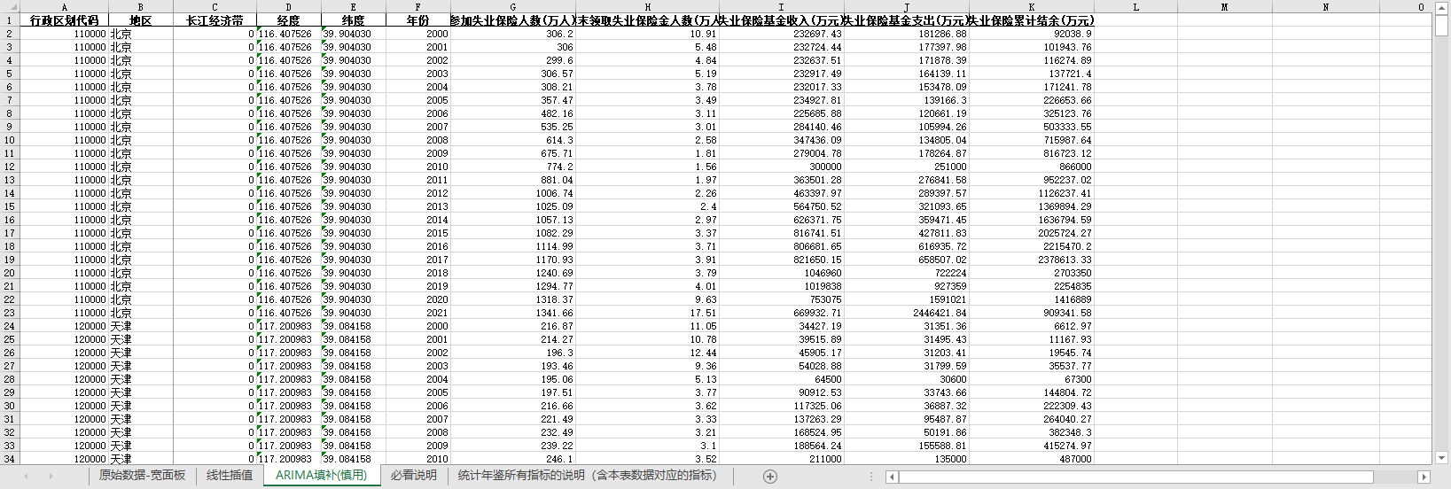 一、全国31个省份参加领取失业保险金人数基金收入支出结余2000-2021含无缺失值填补含经纬度