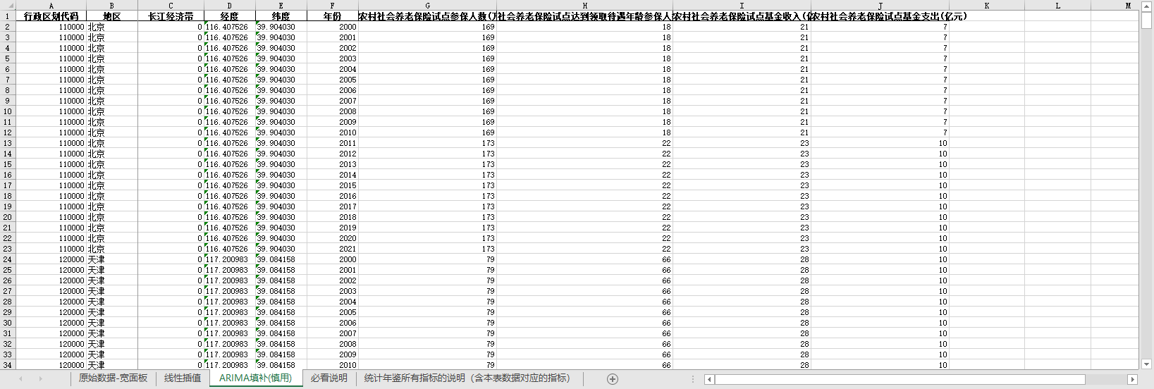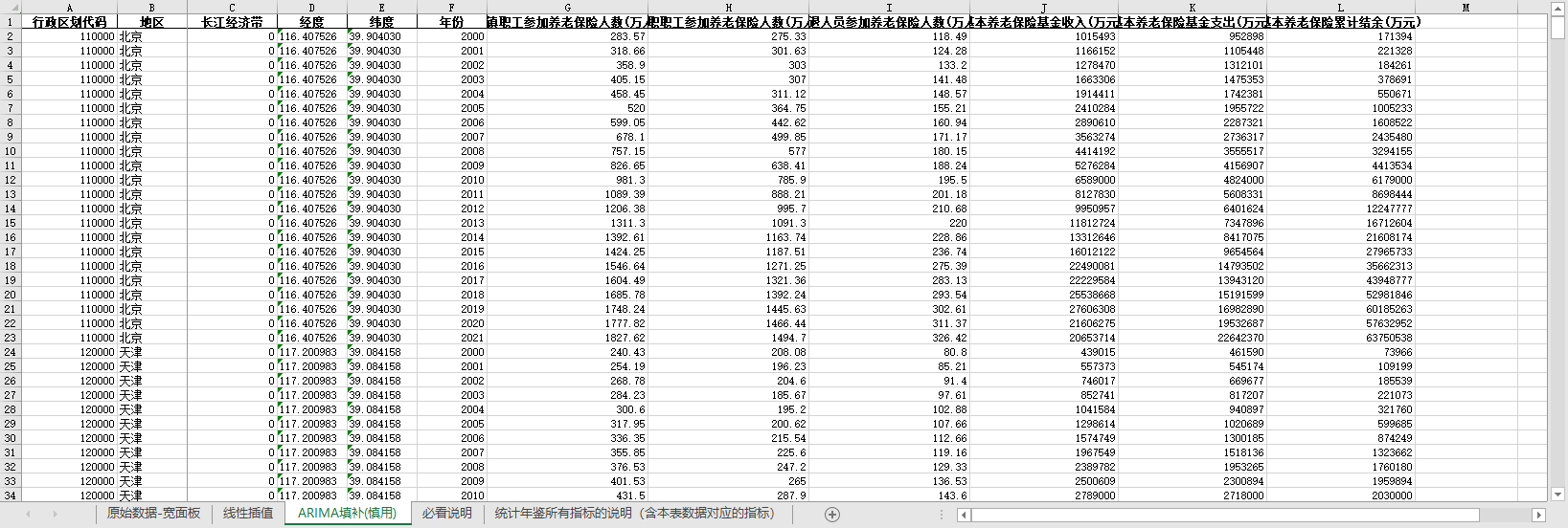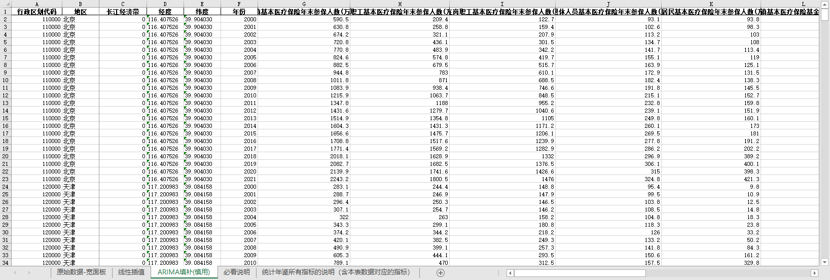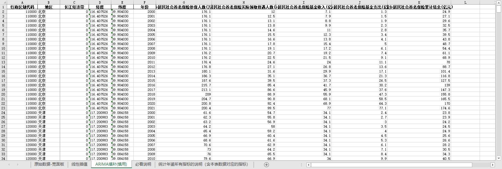 excel数据文件包原始数据-宽面板(由于多年度指标不同存在缺失值)、线性插值、ARIMA填补三个版本,提供您参考使用。
