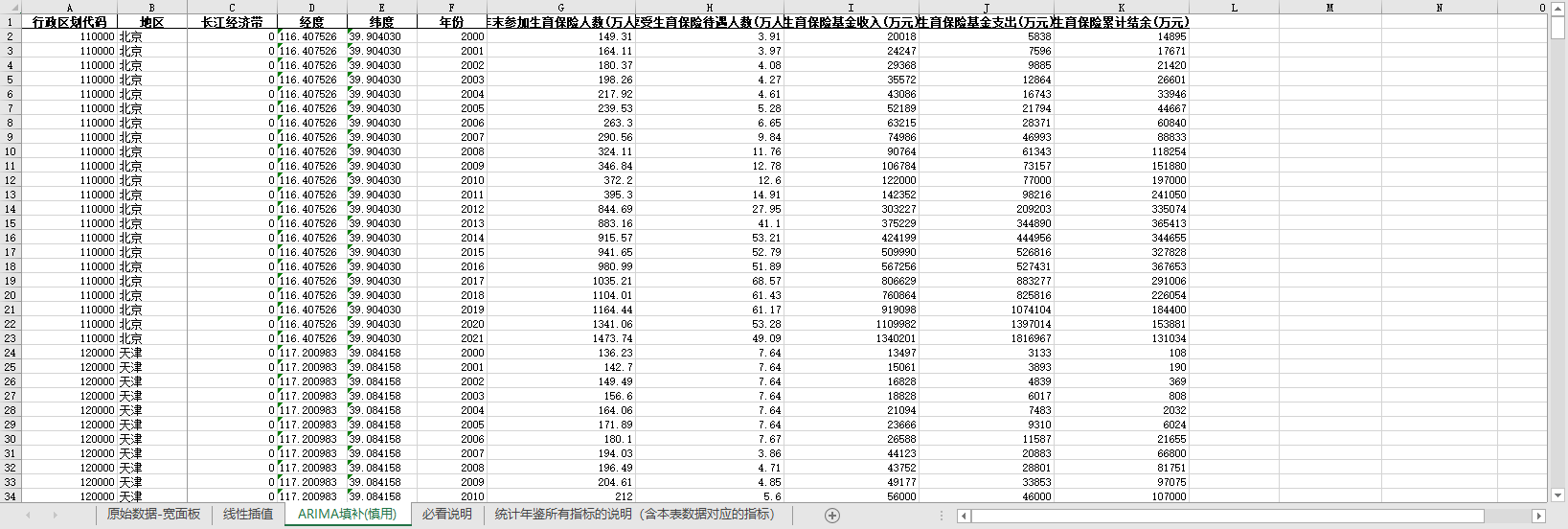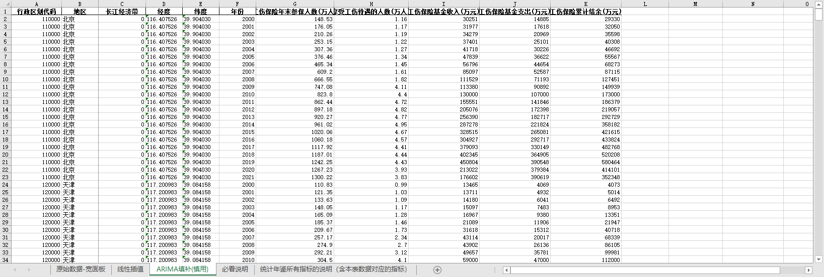 全国各省基本医疗养老生育工商失业保险金人数基金收入支出结余2000-2021含无缺失值填补含经纬度