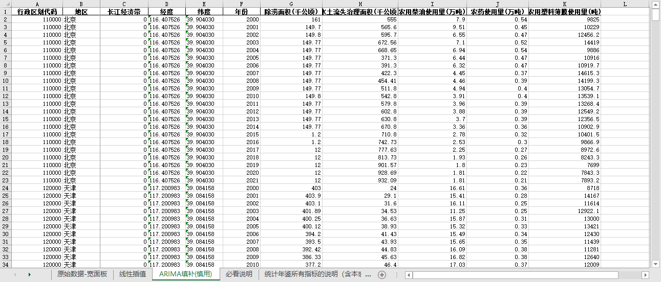 ARIMA填补。基于ARIMA模型,利用同一地区的时间序列数据,对缺失值进行预测填补。