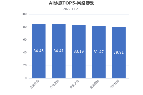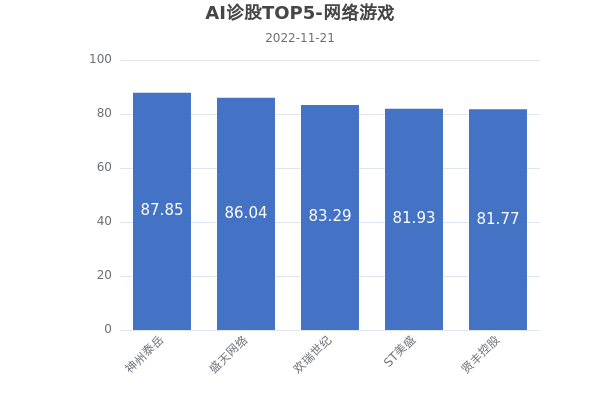本部分通过AI对网络游戏概念内的78只股票进行多维度分析,其中AI诊股综合得分最高的5家公司为:完美世界、三七互娱、浙数文化、恺英网络、皖新传媒。
