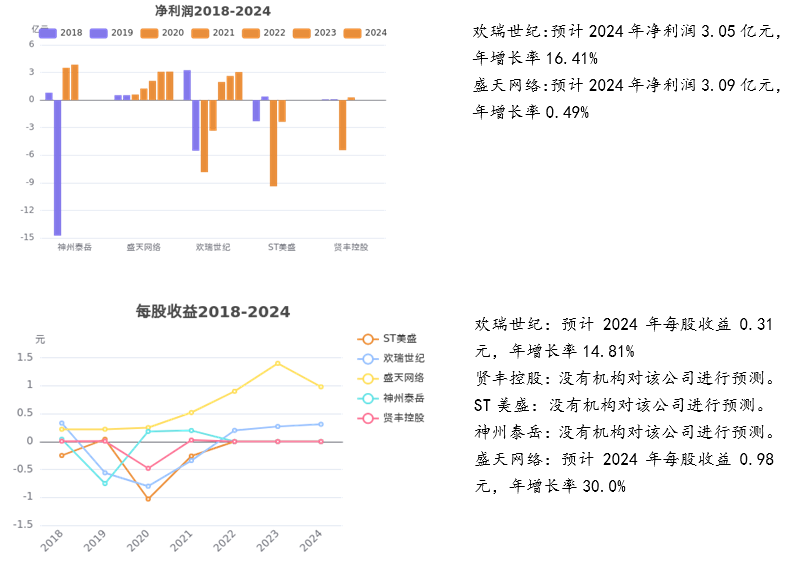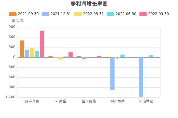 净利润增长率是指企业当期净利润比上期净利润的增长幅度,指标值越大代表企业盈利增长能力越强。本期净利润增长率排序(由高到低):贤丰控股、ST美盛、盛天网络、欢瑞世纪、神州泰岳。