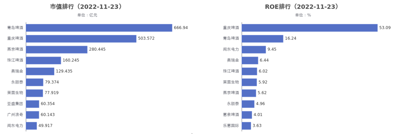 ROE排名TOP5上市公司:重庆啤酒、青岛啤酒、闽东电力、奥瑞金、珠江啤酒。