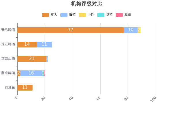 珠江啤酒近12个月,7家研究机构出具的14份研报将其列为“买入”等级,11份研报将其列为“增持”等级。