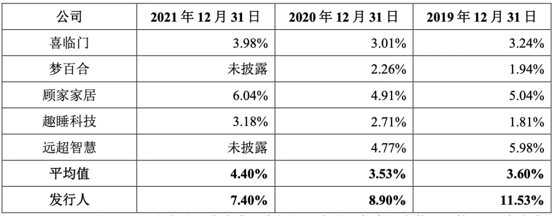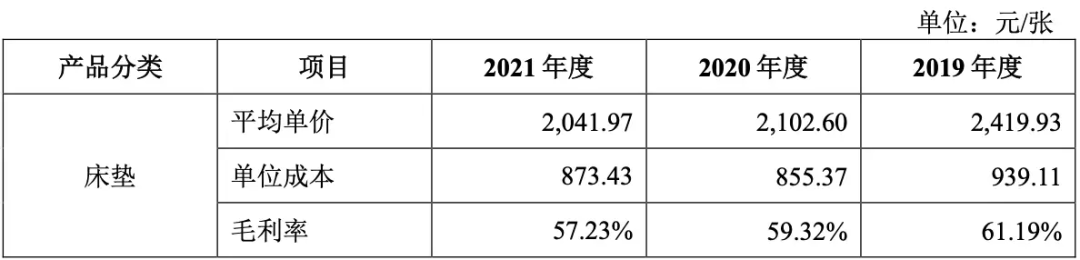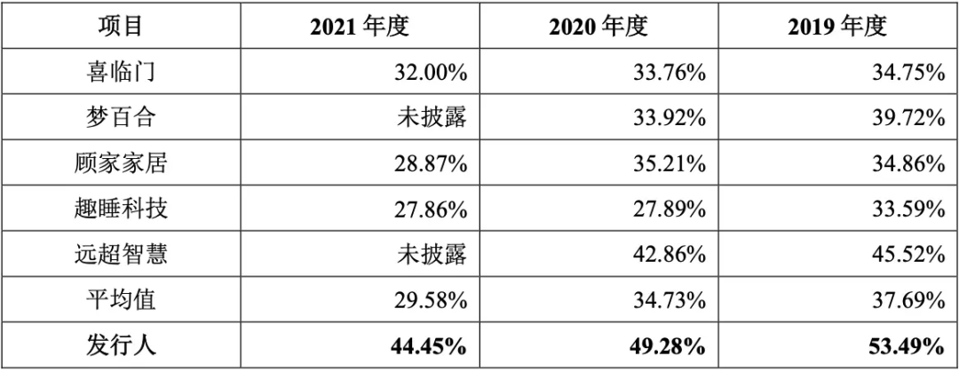 慕思的毛利也为业内最高。据招股书显示,2019年-2021年,慕思的综合毛利率在45%左右,高于喜临门和梦百合及其他同行。