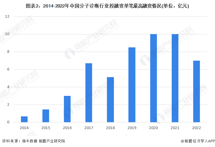 从历年单笔最高融资金额来看,2014-2022年,我国分子诊断行业单笔最高融资金额总体呈现增长态势,其中2020年和2021年最高融资金额均达到了10亿元人民币,2022年虽然有所下滑,但仍然在6亿元人民币以上。