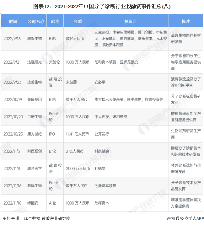 2021-2022年年我国分子诊断行业的主要投融资事件如下: