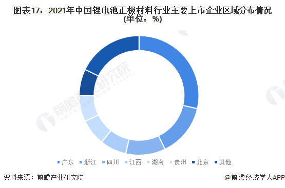 从前瞻统计的锂电池正极材料行业28家代表性上市企业的区域分布来看,锂电池正极材料行业的上市公司主要集中在中南、东南部地区,其中以广东省和浙江省的上市企业数量居首,二者占比之和接近50%。