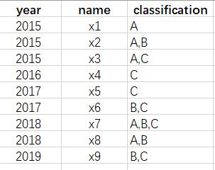 不同的x涉及的对象有3种(A, B, C)。现在想以x涉及的对象为依据对x进行分类,每个x涉及到的对象各不相同。想达到的目的是分析A对象每年涉及到的次数趋势。