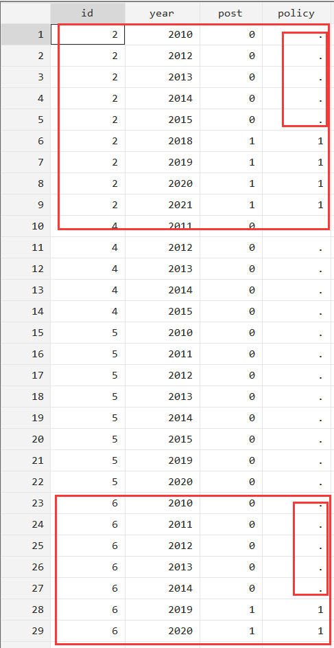 wdlbcj 发表于 2022-11-28 18:01 sort id policy bys id:replace policy=policy[_n-1] if policy==.