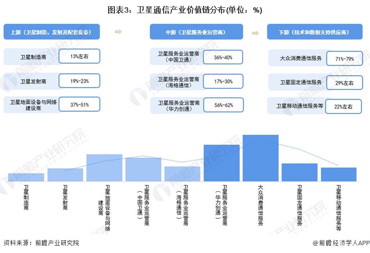 中国通信卫星行业产业链较为复杂,上游涉及多种通信卫星的制造、发射与配套设备和系统的生产,中游为卫星服务业运营商,为下游业务提供技术和数据支持。