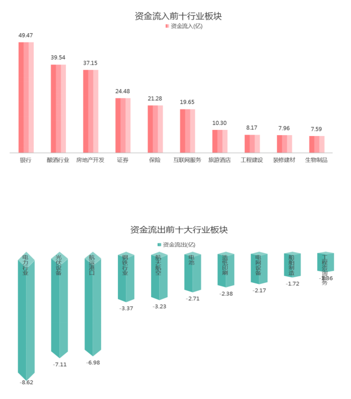 盘面上,银行行业资金流入较多,电力行业资金流出较多。