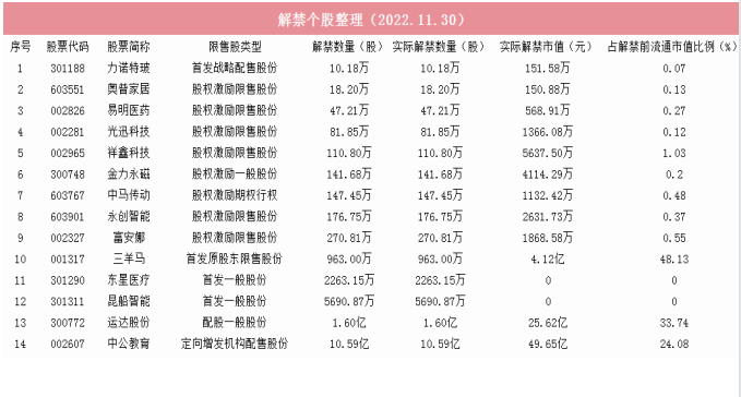 明日两市共计14只个股解禁。