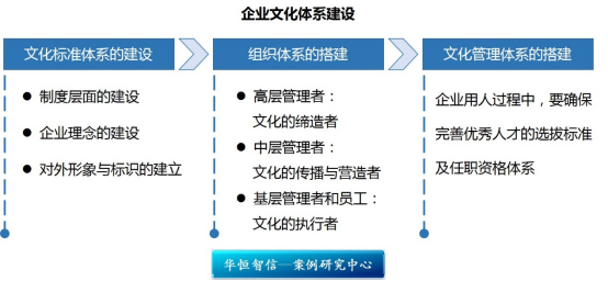 结合企业问题现状,以及对行业内国内外先进企业的文化特征的深入研究,华恒智信顾问专家团队提出企业应该做好公司内部的企业文化体系建设工作: