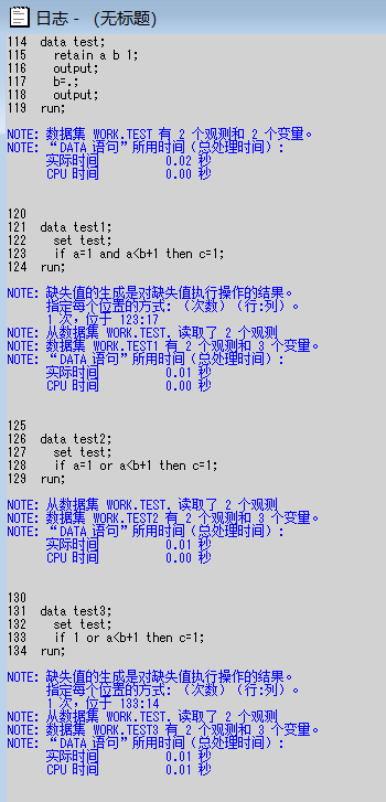 注意到test1数据步报告了缺失值的生成,而test2数据步并没有。我怀疑data步内有某种优化措施,使得逻辑运算语句获得了短路效果。“短路”一次来源于C语言,即仅运行开头的部分运算,整个表达式的结果已经被确定了,因此表达式的其余部分没有被运行。