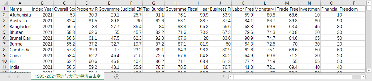 亚洲与大洋洲各国经济自由度指数1995-2021产权政府诚信司法效力税负政府支出商业劳动货币贸易投资自由金融自由
