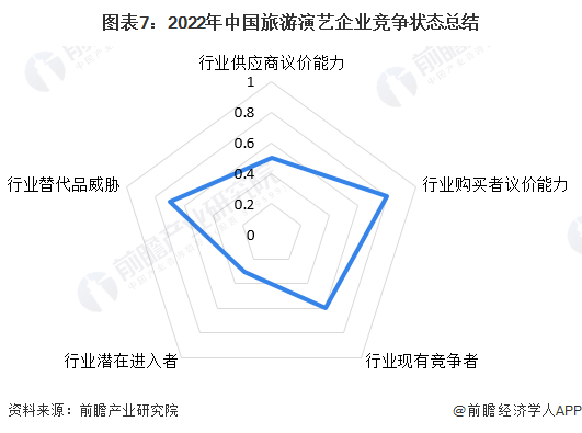 从五力竞争模型角度分析,我国旅游演艺近年企业数量增幅较慢,由于疫情和极端天气影响,剧场、剧院发布演出取消或延期公告,整体市场仍略显疲软。旅游演艺行业盈利难度较大,行业潜在进入者威胁较小。从供需角度看,旅游演艺的受众群体才是评价作品是否受欢迎的人,他们具有决定权。有时候演艺节目会因为吸引观众而降低一定的门票价格。综合来看,中国旅游演艺行业供应商议价能力一般。演艺作品的吸引力和口碑对观众来说才是最重要的。但如果没有太大吸引力,观众就没必要为此买单。因此整体来看,行业购买者议价能力较强。目前我国旅游演艺五力竞争总结如下: