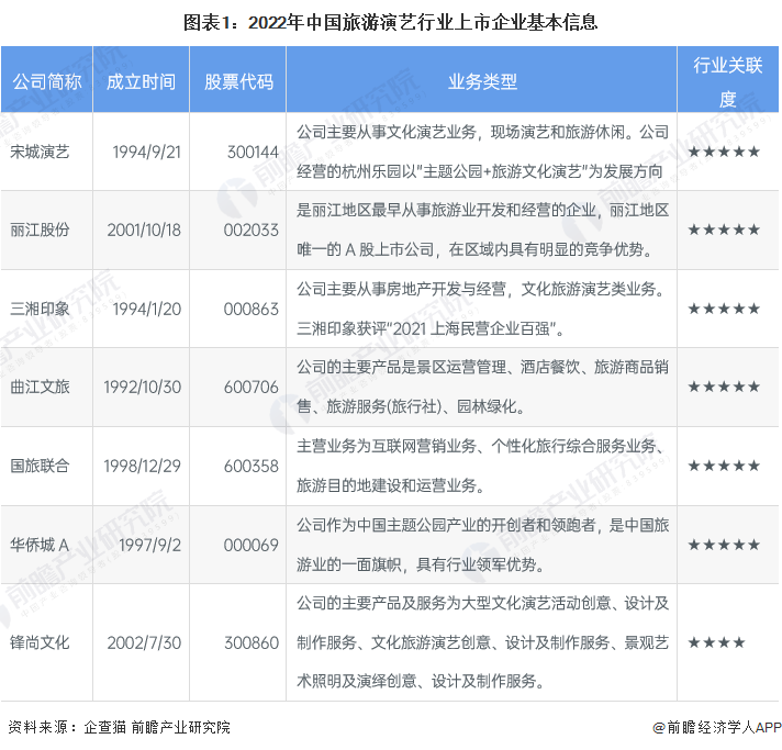 行业主要上市公司:宋城演艺(300144);三湘印象(000863);华侨城A(000069);国旅联合(600358);曲江文旅(600706);丽江股份(002033);锋尚文化(300860)等。