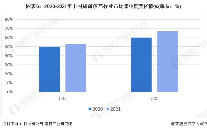 目前,旅游演艺行业因为疫情的不确定性而遭受一定的打击。行业内小型旅游演艺公司因为无法承担高额成本而淘汰,相对来说行业集中度有所提升。但整体上看2021年业内CR3集中度在53%,CR5接近70%,比2020年有所提高。