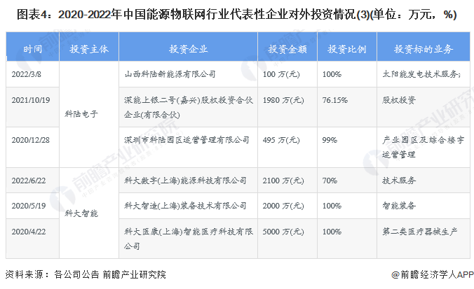 从中国代表性企业的对外投资来看,天合光能、易事特等企业均在不同地区建立了子公司以扩大企业业务规模,提升企业竞争力。2020年以来易事特等企业对外投资数量较多,投资标的的业务也较为丰富。2020-2022年中国能源物联网行业代表性企业对外投资情况汇总如下: