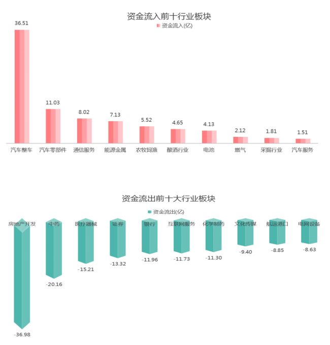 盘面上,汽车整车行业资金流入较多,房地产开发行业资金流出较多。