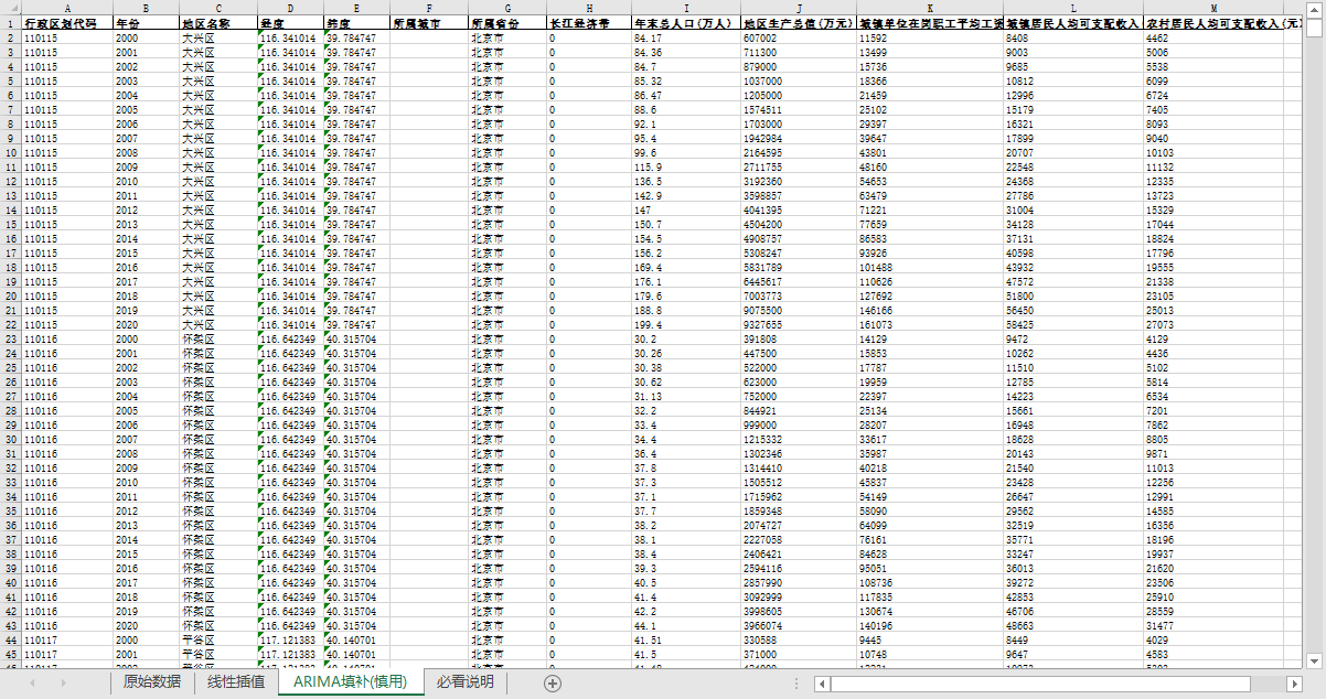 excel数据文件包原始数据(由于多年度指标不同存在缺失值)、线性插值、ARIMA填补三个版本,提供您参考使用。