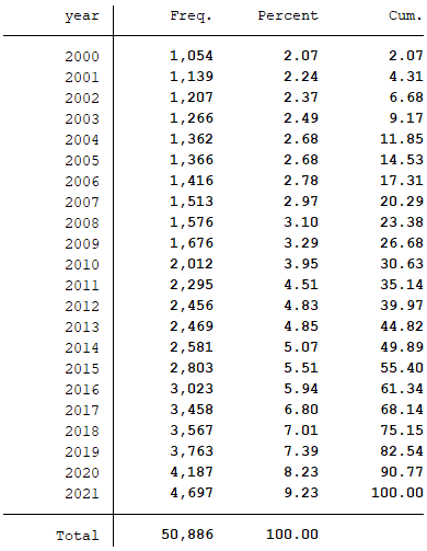 样本选择:全部A股2000-2021年数据(初始数据是从1990年开始,选择的数据起点为2000年,可自行在代码中更改时间范围)