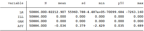我们利用中国上市公司股票交易的微观结构数据(按流通市值加权的市场收益率rm、公司个股日收益率r、日成交量V和年度交易天数D)构建LR、ILL和GAM指标。但正如Hasbrouck(2007)所指出的,上述每个指标既包含与非对称信息相关的成分,也可能包含与非对称信息无关的成分,不能全面刻画信息不对称的全部特征。为此,我们遵循Bharath et al.(2009)的做法,对原始指标提取第一主成分,捕捉它们的共同变异信息也即与非对称信息相关的成分,记为信息不对称指标ASY。