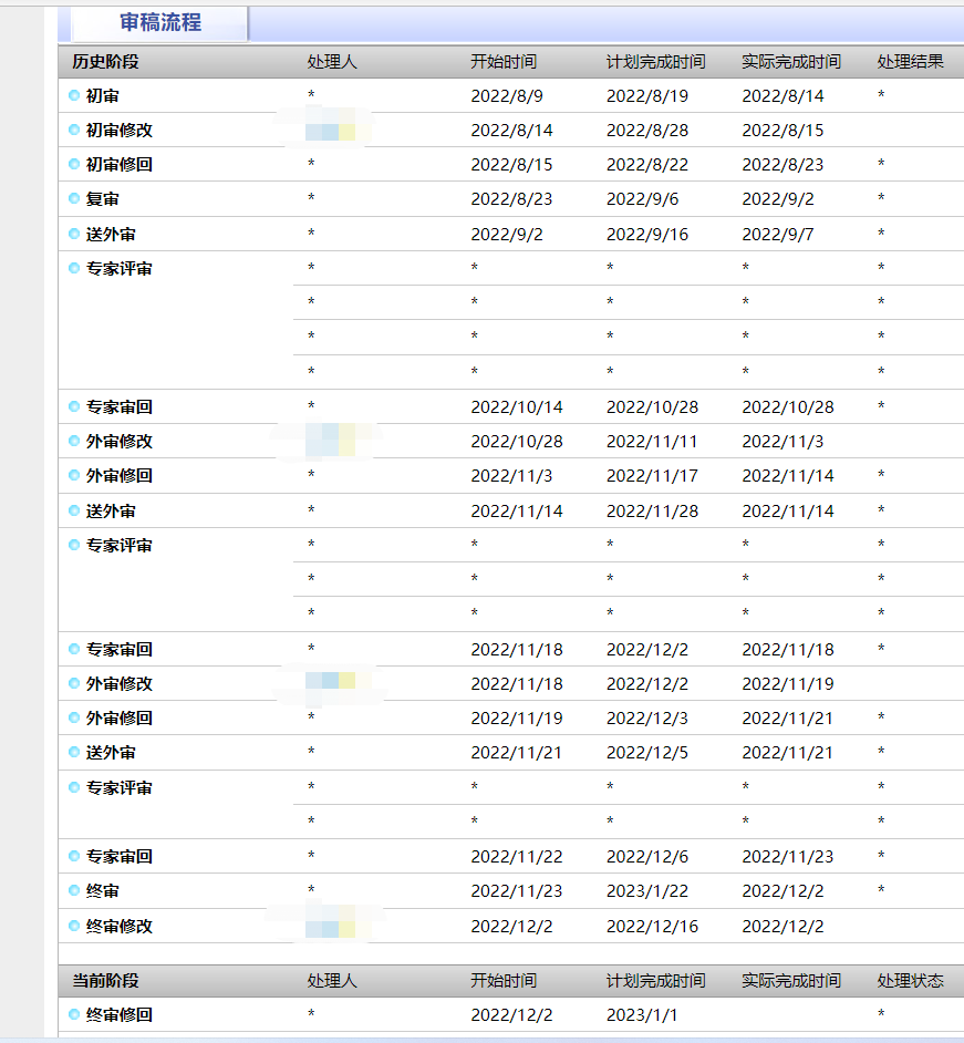 爱琴海sqq 发表于 2022-12-2 15:34 详见流程,也是第一次中,经历了几轮外审、修改,忐忑的不行。应该没问题了,让添加了作者信息和收稿日期