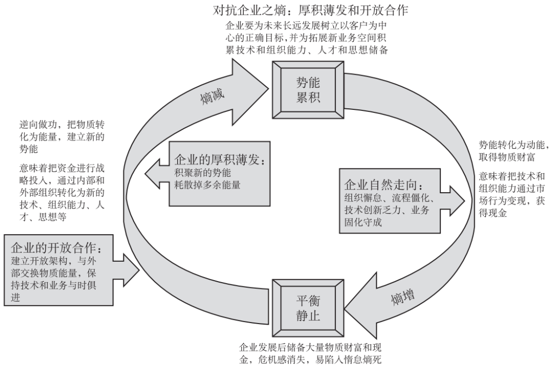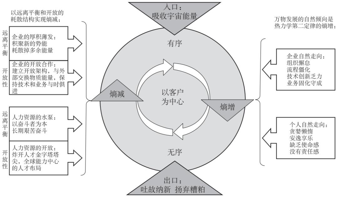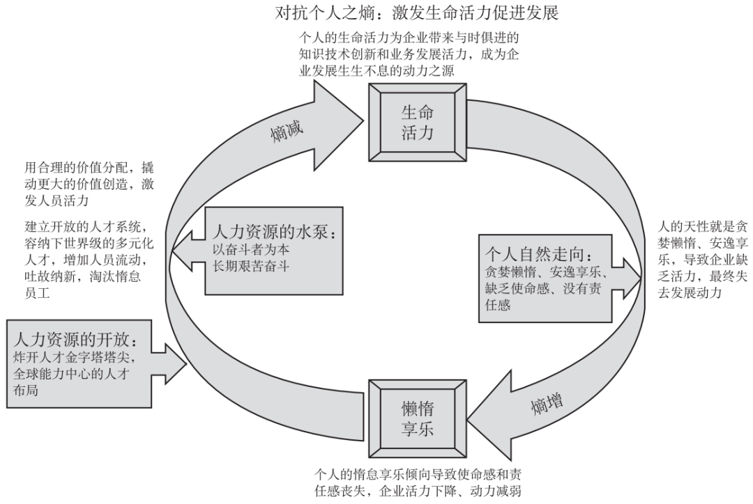 在企业宏观层面,把华为视为一个生命整体,要从企业整体运作的战略高度解决熵增,即利用企业的厚积薄发和开放合作,解决企业发展过程中出现的组织懈怠、流程僵化、技术创新乏力、业务固化守成等问题。在个人微观层面,华为是由无数个体组成的,重在从人力资源管理角度,探索如何激发生命的活力,从而解决人的惰怠和熵增。如图6和图7所示。
