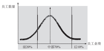 通用电气前CEO杰克·韦尔奇在管理实践中提出了“活力曲线”,这是一种将员工按照20∶70∶10的比例进行动态评估的工具,以区分出员工的业绩与潜力。如图3所示,横轴表示员工一定时期内的业绩表现(从左向右递减),纵轴表示达到相应业绩值的员工数量。由此,帮助企业区分出哪些人属于A类员工(较好的前20%),哪些人属于B类员工(中间的70%),而哪些人属于C类员工(较差的后10%),以此为基础可实现对员工的分类管理,包括激励、职位调整以及培训等内容。