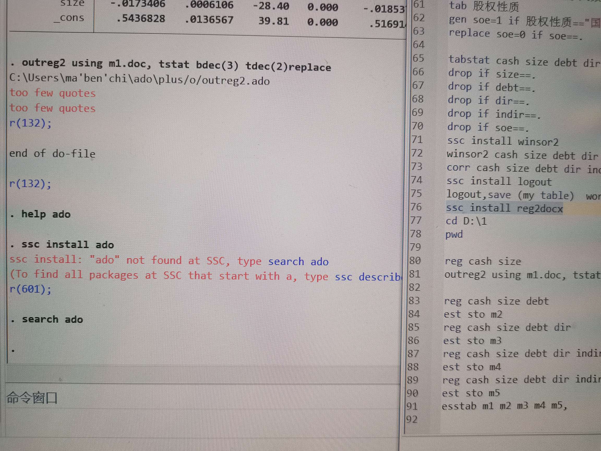 用stata16.0进行ols分析显示too few quotes是什么问题