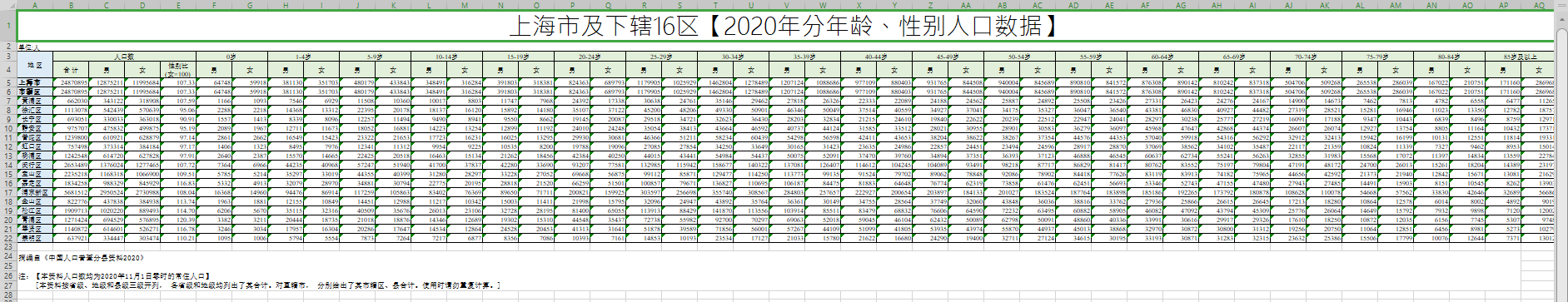 上海市及下辖16区【2020年分年龄、性别人口数据】