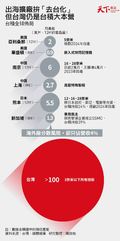美國Arizona廠目前已宣布的5奈米廠(N4製程技術)1個月生產約2萬片,新宣布的3奈米廠約1個月2.5萬片,合計到2026年約一年可生產60萬片;目前台積電一年的產能(以12吋晶圓為單位計算)約1356萬片,美國僅占4%左右,更何況2026年預期台積電的產能又將大舉提高,占比會更降低,完全沒有「半導體產業鏈正在去台化」問題。