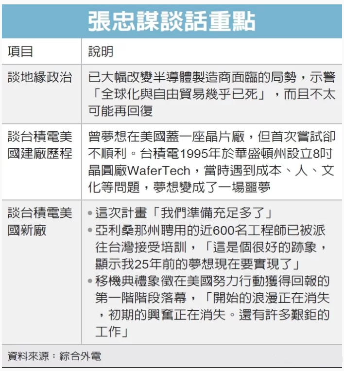 雖說張忠謀此前一直反對“美國晶片計畫”,主要還是因為在美建廠成本高、人才少。但這次儀式上,張忠謀稱,“全球化幾乎死了,自由貿易也幾乎消亡。”台積電還將臺灣人才引進美國晶圓廠。