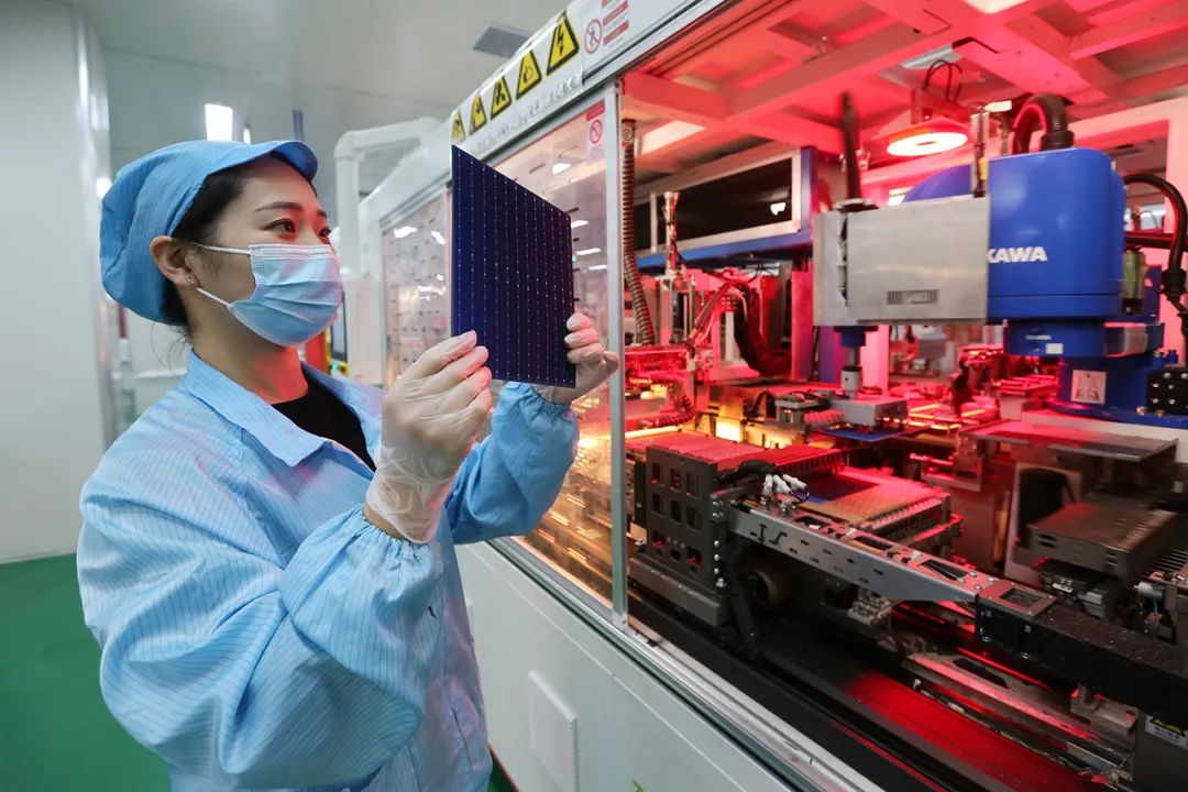 2022年11月24日,安徽省淮北市烈山经济开发区一家光伏电池生产企业车间,工人在生产线上查看产品。图|IC photo