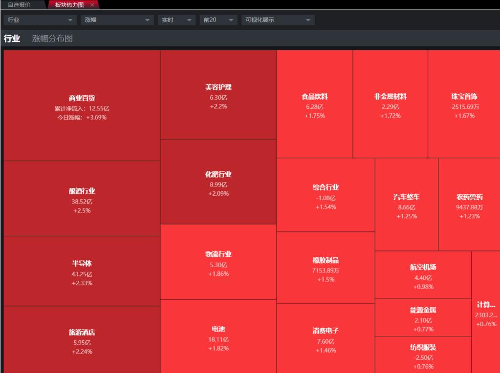 【热点板块】今日板块通过热力图来看,涨幅靠前的是商业百货、酿酒行业、半导体、美容护理、化肥行业、电池、食品饮料等板块。四维分析来看,今天市场热点板块又出现了转化的迹象,中字头板块为首的国企改革、低价权重等板块出现较大幅度的波动,中国科传一度触及跌停,中国联通也是出现了中阴线的调整,也出现了短线部分资金离场的迹象。资金新的出击方向就是大消费板块,包括了商业百货、酿酒行业、食品饮料等,以商业百货板块为例,上一次炒作还要追溯到20年中旬当时是炒作了一波新零售的概念,之后一直是维持横盘震荡的走势,始终没有太好的表现,而目前这一波轮动补涨终于轮到了商业百货,再加上一些利好的预期出现了反弹,永辉超市、东百集团、深赛格等5只股票涨停,其他也是跟随出现不同程度的反弹,反弹的性质其实也是中期低位品种的补涨,指数这一波上涨商业百货涨幅是明显落后其他板块和指数的,短期也是开始加速补涨了,这一波反弹暂时只能是看做短线反弹、或者是波段的反弹。而今天的中阳线也留下了较长的上影线,面对前期高点的压力能否继续上攻还是继续观察。酿酒板块也是一样,一波连续反弹之后逼近了前期6月30日的高点,但是没有成功创出新高也是留下了较长上影线,连续反弹之后短期也是有调整压力。