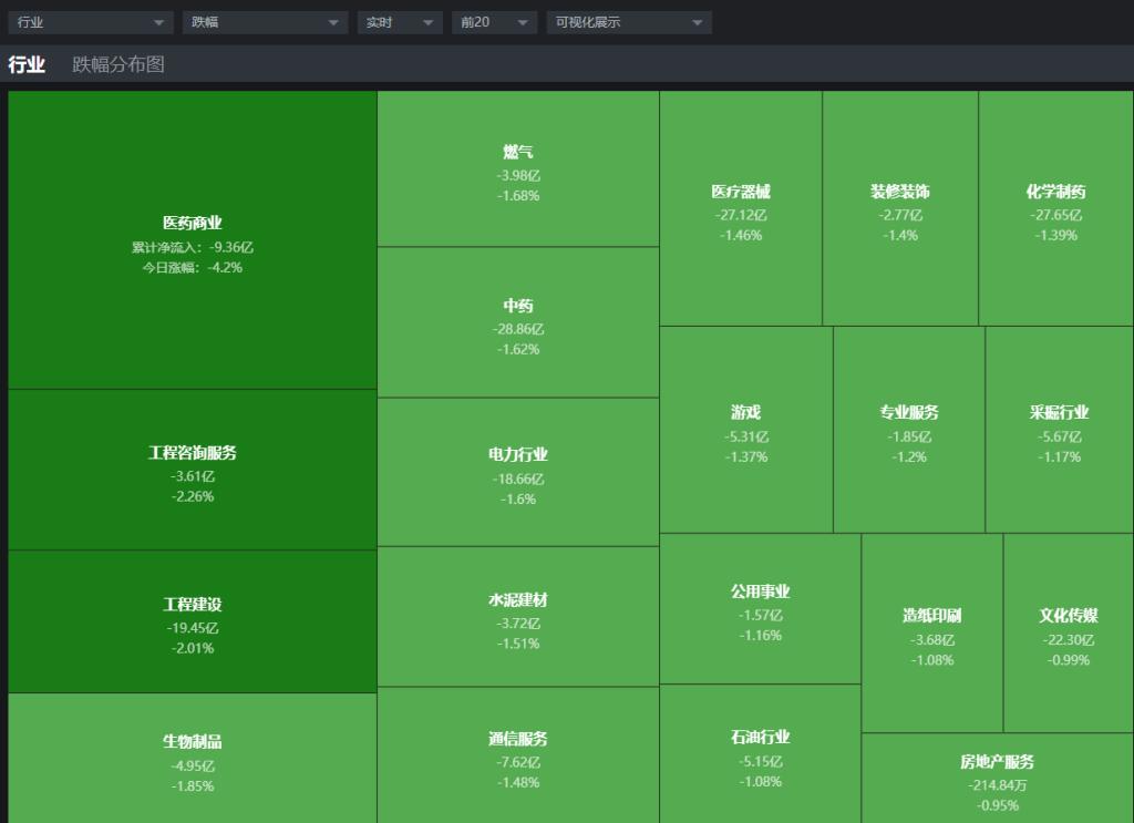 再来看一下跌幅榜,通过热力图来看跌幅靠前的医药商业、工程咨询服务、工程建设、燃气、中药等,近期表现强势的板块都开始出现了调整,包括中期比较强的中药、医药商业,也包括这一个阶段表现抢眼的中字头板块,下一个阶段来看短期涨幅较大的板块和个股有一个调整的需求,要防止强势品种高位补跌,通常这种补跌的速度都会很快。