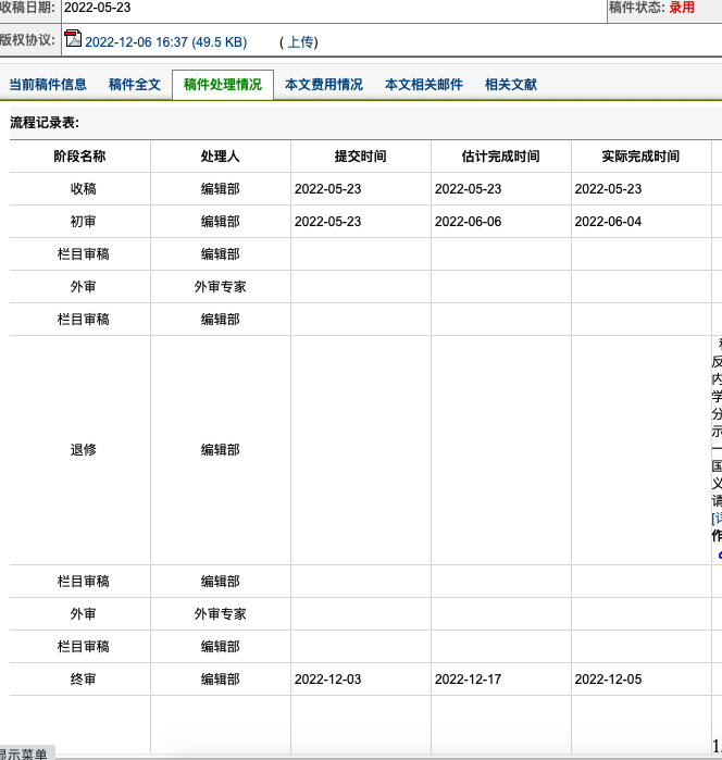 退修:12.5—12.6(主要是技术规范、补全作者信息、版权协议;期间上传了原文PDF格式,编辑部晚上又退修了一次,我随即改了word版)