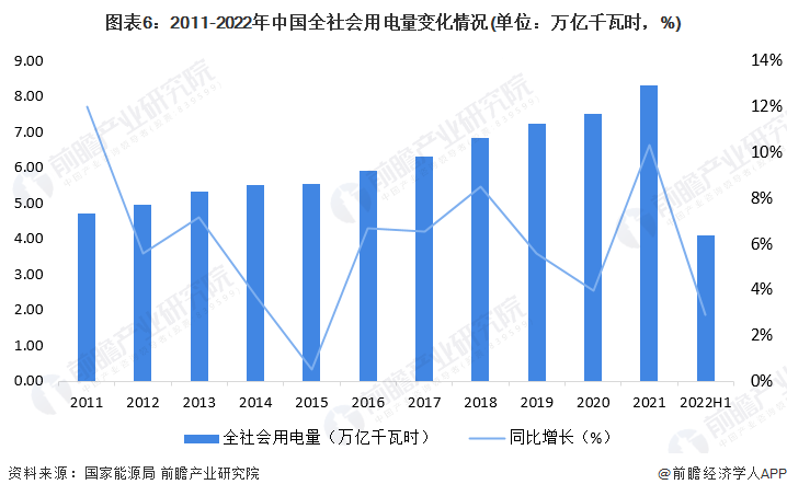 2011-2021年,全社会用电量逐年增长。全国电力供需形势总体平衡。随着疫情得到有效控制以及国家逆周期调控政策逐步落地,复工复产、复商复市持续取得明显成效,社会用电稳定恢复。2021年,全国全社会用电量83128亿千瓦时,同比增长10.3%,两年平均增长7.1%。2022年上半年,全国全社会用电量4.10万亿千瓦时,同比增长2.9%。一、二季度,全社会用电量同比分别增长5.0%、0.8%,二季度增速明显回落主要因4、5月受部分地区疫情等因素影响,全社会用电量连续两月负增长。