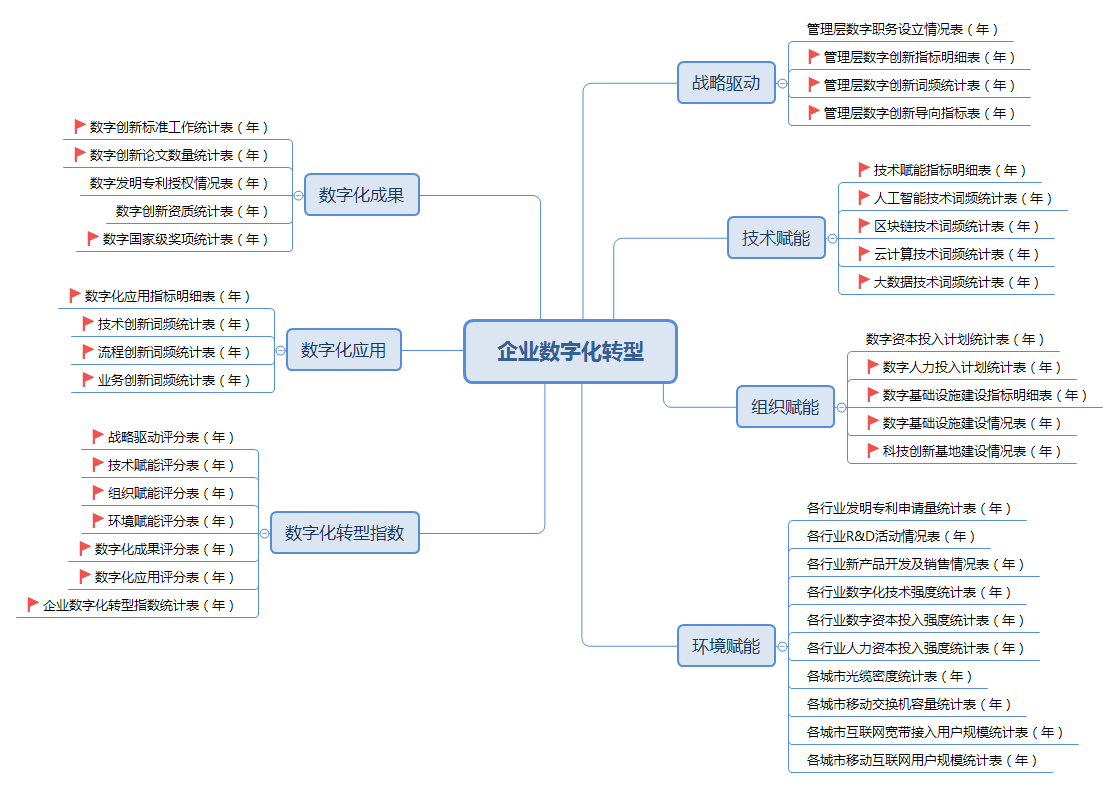 CSMAR中国上市公司数字化转型研究数据库提供上市公司层面的战略引领、技术驱动、组织赋能,数字化成果及应用,中宏观层面的环境支撑,以及构建了企业数字化转型评价指数。